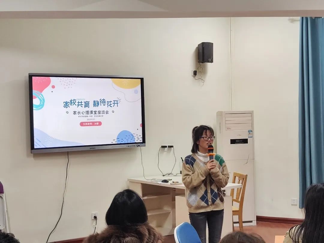 2023年3月6日晚7:00,高三家长委员会的学生家长们齐聚一堂。学生发展中心主任刘蓉老师向各位家长说明本次家长心理课堂座谈会的主要目的和主要计划安排。