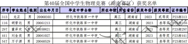 怀铁一中五位学子在2023年物理竞赛(省赛)中获奖
